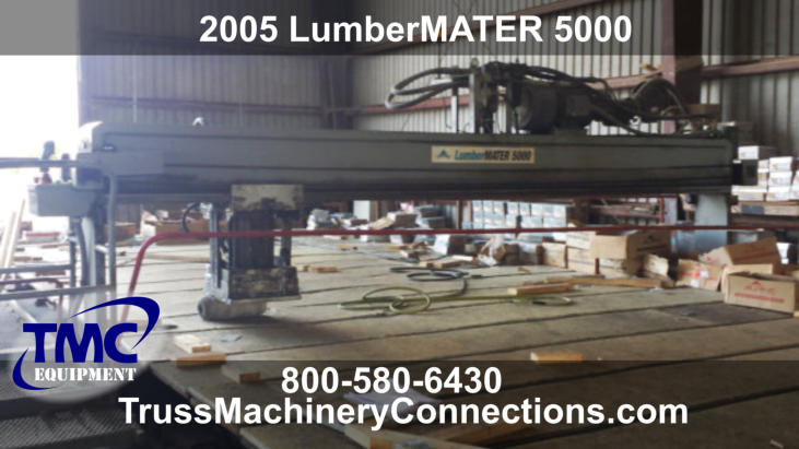 Item No. R804612005 LumberMATER 5000LumberMater with 15’x60’ Table with plastic tops and jigging struts. Kick-leg table design, powered gantry with vertical hydraulic pressing head. Equipped with a ride-on operator platform with joy-stick control.Status: SOLDPrice: $18,000Condition: GoodLocation: FL